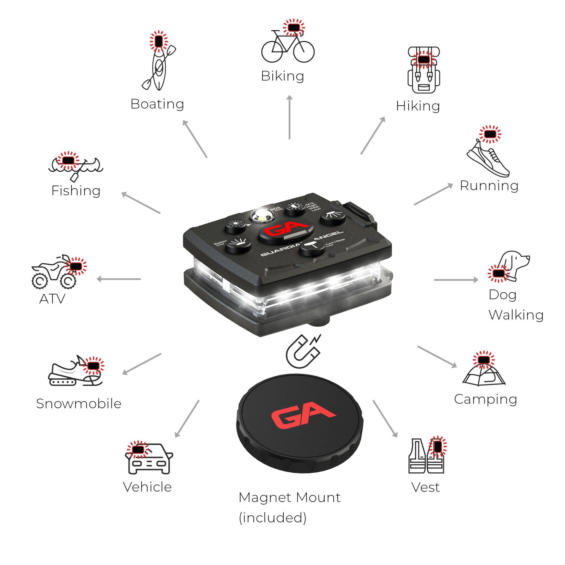 Le GUARDIAN ANGEL est doté d'un aimant en néodyme intégré au produit à des fins de fixation. Les personnes portant un stimulateur cardiaque ou un dispositif médical similaire ne doivent pas utiliser le GUARDIAN ANGEL. Les champs magnétiques puissants peuvent affecter le fonctionnement de ces appareils. Les aimants en néodyme peuvent également endommager les supports magnétiques tels que les cartes de crédit. Par exemple, ne transportez pas l'ANGE GARDIEN dans la même poche que vos cartes de crédit.