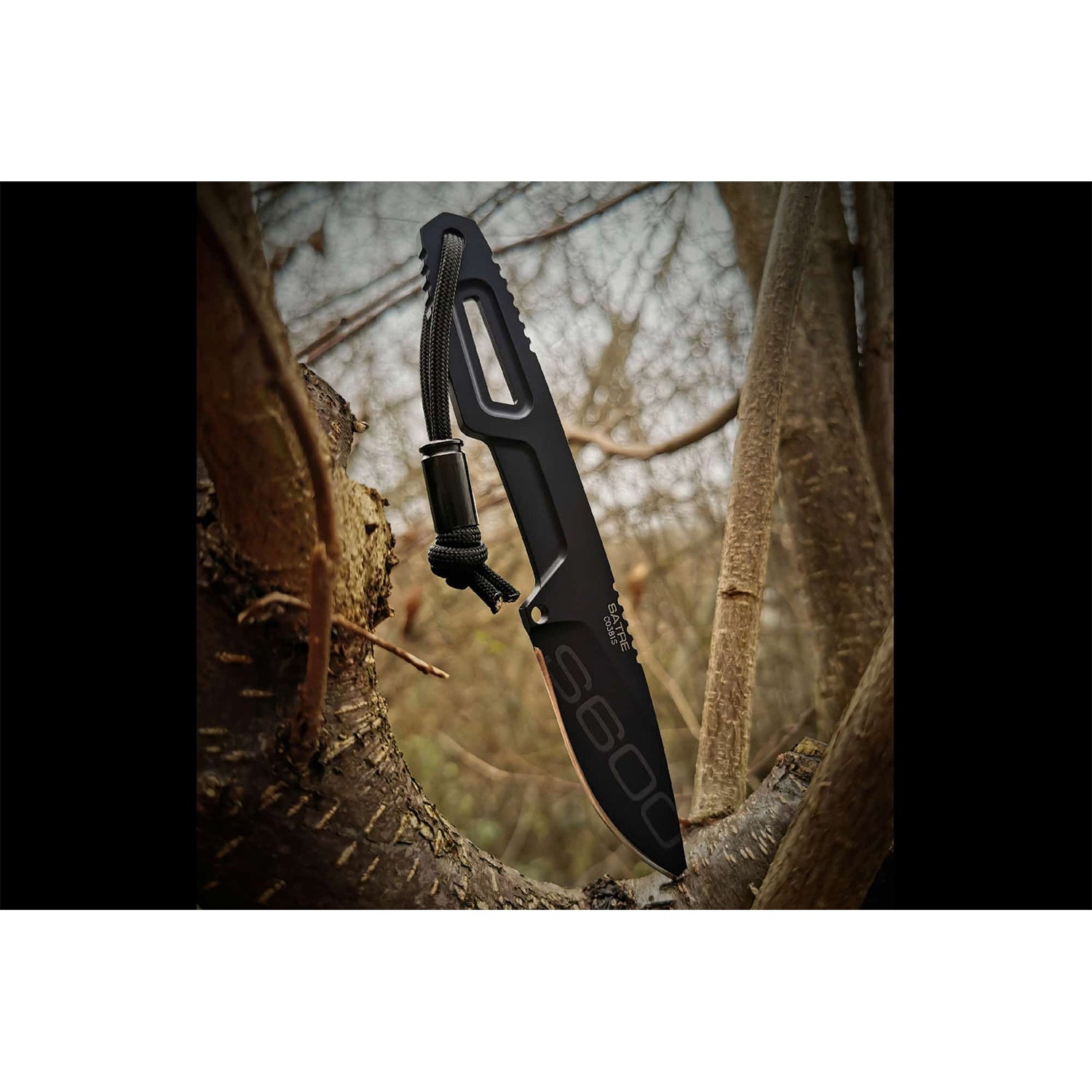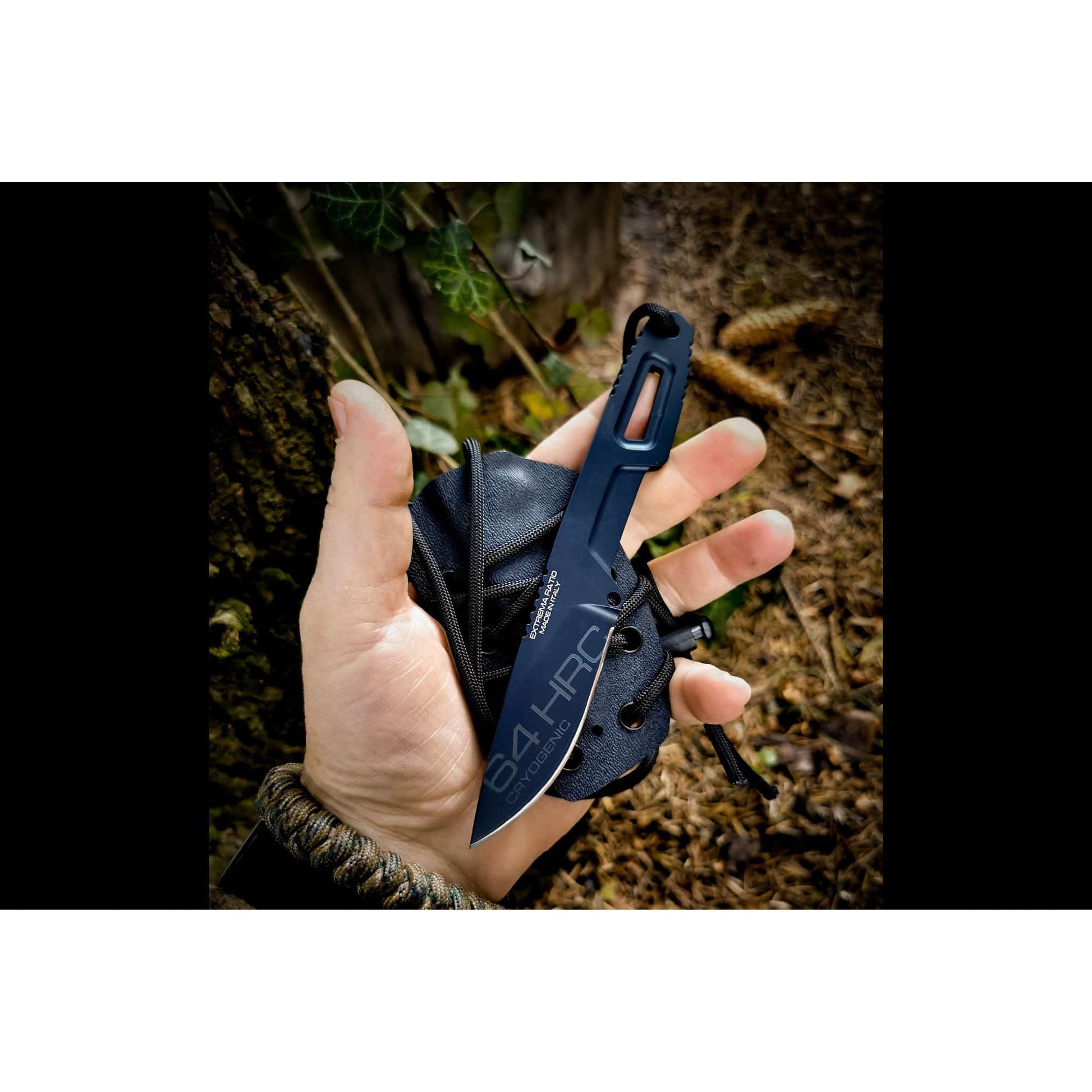 Grâce à la dragonne en paracorde 550 fournie, le couteau peut se porter autour du cou , verticalement, manche vers le bas, pour un accès rapide et sûr. L' étui Kydex pré-moulé est doté d'œillets permettant l'utilisation de la dragonne et la fixation d'accessoires.