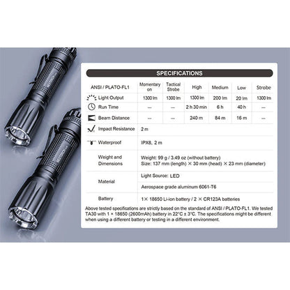 Lampe de poche tactique LED TA30 V2.0, 1 300 lumens (batterie incluse)