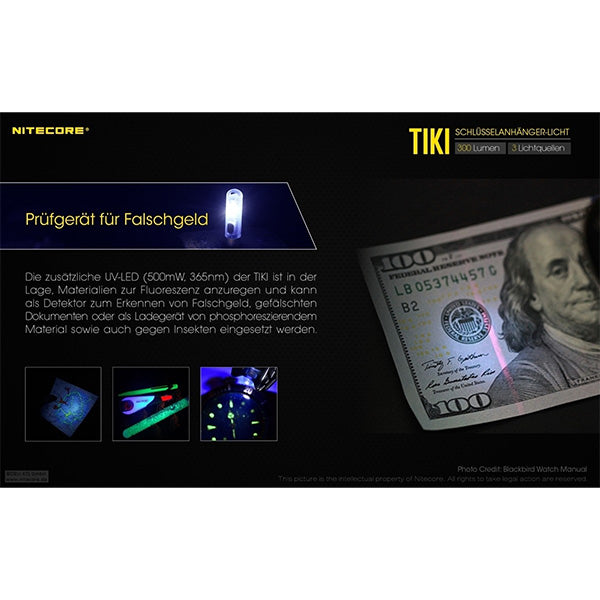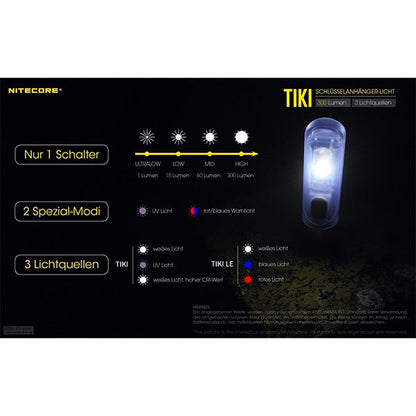 La Nitecore TIKI est une lampe torche porte-clés compacte mais puissante, dotée d'une batterie Li-ion intégrée rechargeable via un port micro-USB. La LED OSRAM P8 délivre une puissance maximale de 300 lumens. Outre sa LED principale, la Nitecore TIKI intègre une LED IRC et une LED UV.