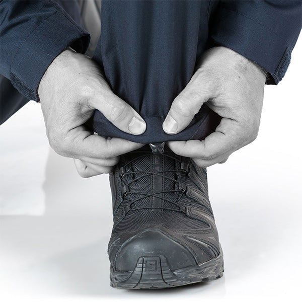 Faites glisser votre ceinture dans les doubles boucles renforcées CORDURA® du pantalon (cela empêche la ceinture chargée de s'affaisser). Ensuite, utilisez le crochet situé au bas des jambes du pantalon pour relier le pantalon à vos bottes (afin que le tissu ne remonte pas et n'expose pas vos mollets).