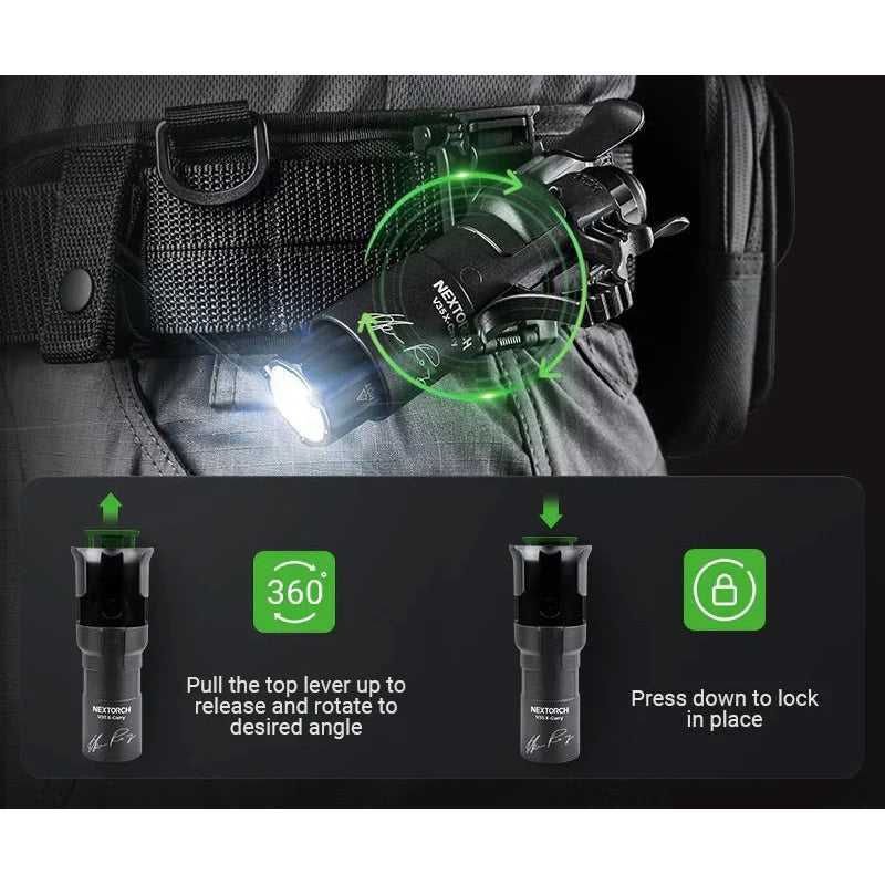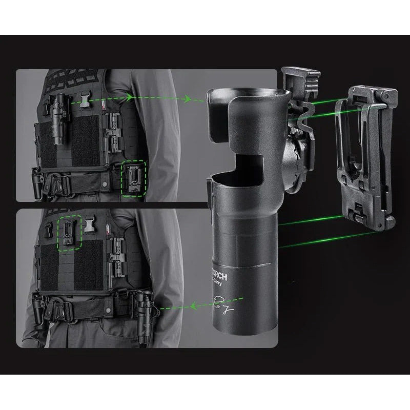 L' étui V35 Quick-Draw de Nextorch est la dernière génération du système éprouvé NQD (Next Quick Draw). Il offre un retrait ultra-rapide, un design élégant et un véritable réglage à 360°. Conçu pour les patrouilles, il offre un réglage de ceinture amélioré (38-50 mm), une transition fluide entre la ceinture de service et le système MOLLE, et un port d'éclairage inférieur pour un éclairage mains libres, la lampe restant bien fixée dans l'étui. Le V35 est compatible avecles NEXTORCH TA30C / TA20 avec anneau FR-1.