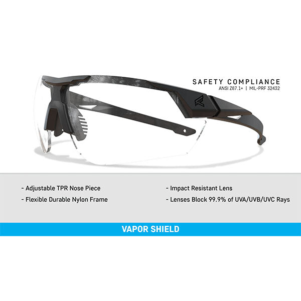 EDGE ha sviluppato una tecnologia antiappannamento permanente nel 1993 e l'ha chiamata Vapor Shield. A differenza di altri rivestimenti antiappannamento temporanei presenti sul mercato, viene incorporato nelle lenti durante il processo di produzione. Il risultato è una soluzione permanente per arrestare la formazione di nebbia causata dal vapore acqueo sulla superficie delle lenti.