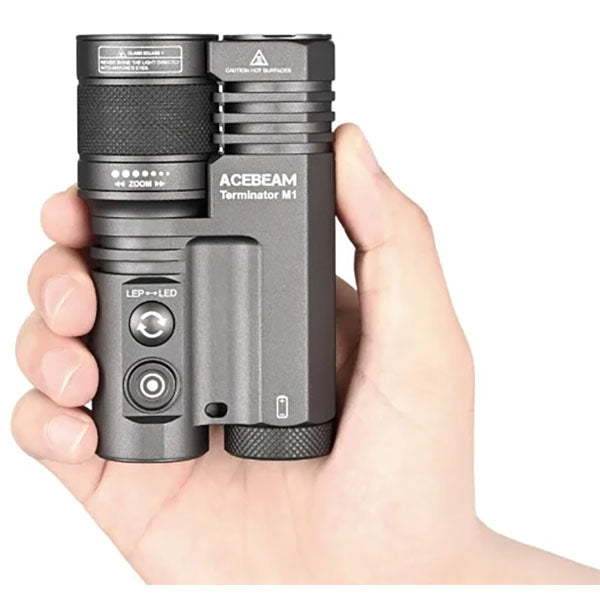 Der TERMINATOR M1 DUAL HEAD ist ACEBEAM‘s erste Lampe, das die neuesten LEP- und LED-Technologien kombiniert. Das LEP-Modul erzeugt einen fokussierbaren Spotlight-Strahl von bis zu 1600 Metern! Wechsle einfach zwischen Spotlight und Floodlight mit einer Schnelltaste. Betrieben wird der TERMINATOR M1 DUAL HEAD von einem leistungsstarken wiederaufladbaren USB-C 21700 Li-Ionen-Akku. Der perfekte Ersatz für die ultimative Flutlicht-, Spotlight-, Signal- oder jede andere Beleuchtung.