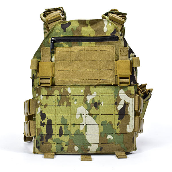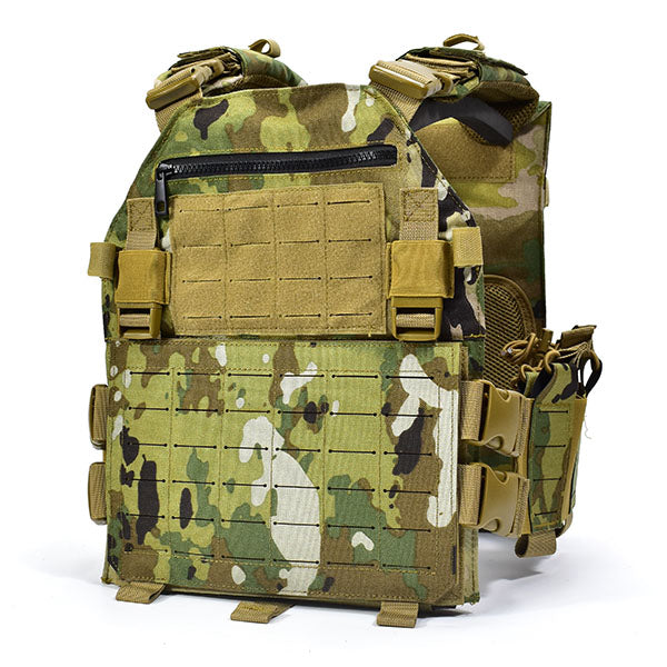 Die beiden Seitenteile dieses Plattenträgers sind elastisch und können zusätzlich noch in der Grösse justiert werden. Ebenso sind die beiden Träger verstellbar. Der Plattenträger fasst zwei Hartballistik-Schutzplatten (nicht mit inbegriffen) in der Standardgrösse von 25cmx30cm und ist zudem vorne und hinten mit praktischen Klettflächen ausgestatten. Frontseitig verfügt dieser Plate Carrier auf Brusthöhe eine mit Reissverschluss verschliessbare Tasche.