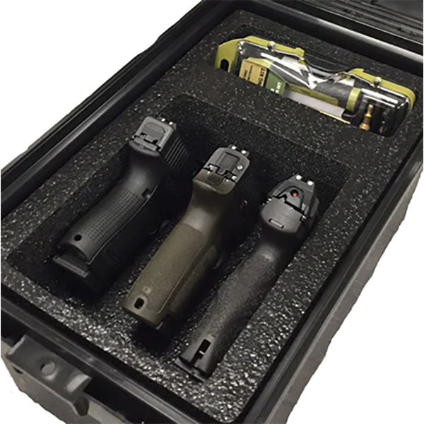 Lagere und transportiere 3 halbautomatische Handfeuerwaffen mit Platz für Magazine oder andere Ausrüstungsgegenstände.
