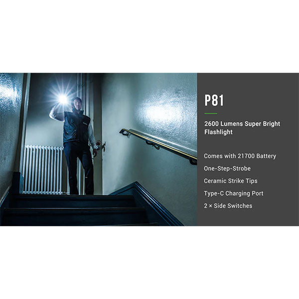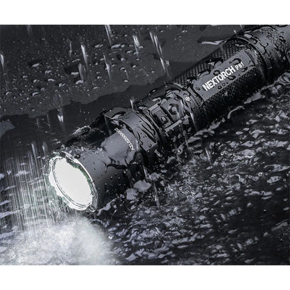 Die taktische Einsatzlampe P81 von NEXTORCH liefert eindrückliche 3'000 Lumen Lichtstrom und kommt mit einem sehr starken 21700 Akku (4800mAh). Vorne an der Linse befindet sich für Notsituationen ein Glasbrecher, der aus praktisch unverwüstlichem Nano-Keramik gefertigt ist. Das aus gehärtetem Aluminium gefertigte Gehäuse der P81 ist absolut wasserdicht sowie stossfest und übersteht Stürze aus 2 Meter Höhe unbeschadet.
