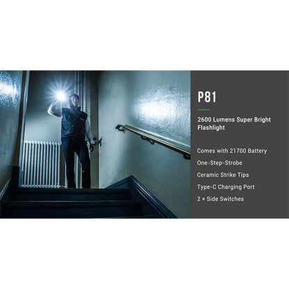 Mit der LED der neusten Generation erreicht die P81 von NEXTORCH eine maximale Leuchtweite von eindrücklichen 270 Metern. Der im Lieferumfang enthalten Akku hat volle 4800mAh und verfügt über einen integrierten USB-C-Anschluss. Dank dem starken Akku hält die P81 sogar in der höchsten Leuchtstufe von 3'000 Lumen volle 2h 45min durch! Eine Status-Anzeige an der Seite informiert jederzeit über den aktuellen Ladezustand des Akkus.