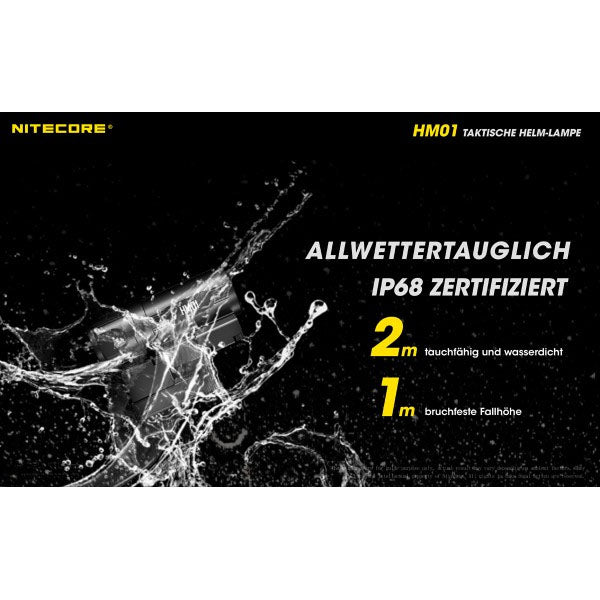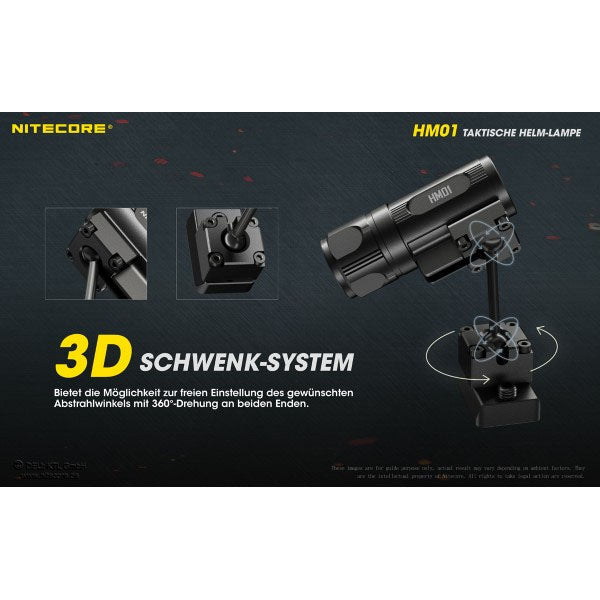 Die Nitecore HM01 ist eine taktische Helmlampe, geeignet zur Montage an einen Einsatzhelm mit ARC-Schiene. Die HM01 verfügt über 2 Helligkeitsstufen, High (320 Lumen und Low (35 Lumen). Durch das 3D-Pivot-System lässt sich der Abstrahlwinkel der Nitecore HM01 optimal einstellen. Die Bedienung der HM01 ist intuitiv.