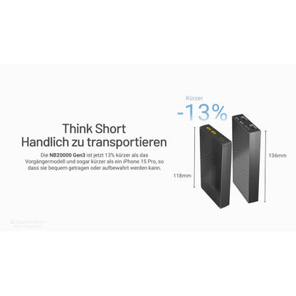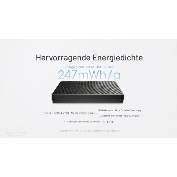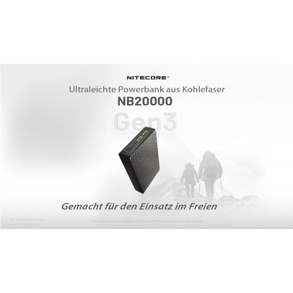 Die Nitecore Powerbank NB20000 GEN3 gehört zur neuen Produktkategorie "Power Solutions" von Nitecore. Sie ist eine besonders elegante und kleine Powerbank undwiegt nur ca. 291 g. Es wird eine maximale Leistung von 22,5W erreicht. Die NB20000 GEN3 unterstützt mehrere Ladeprotokolle wie QC, PD, FCP uns SCP.