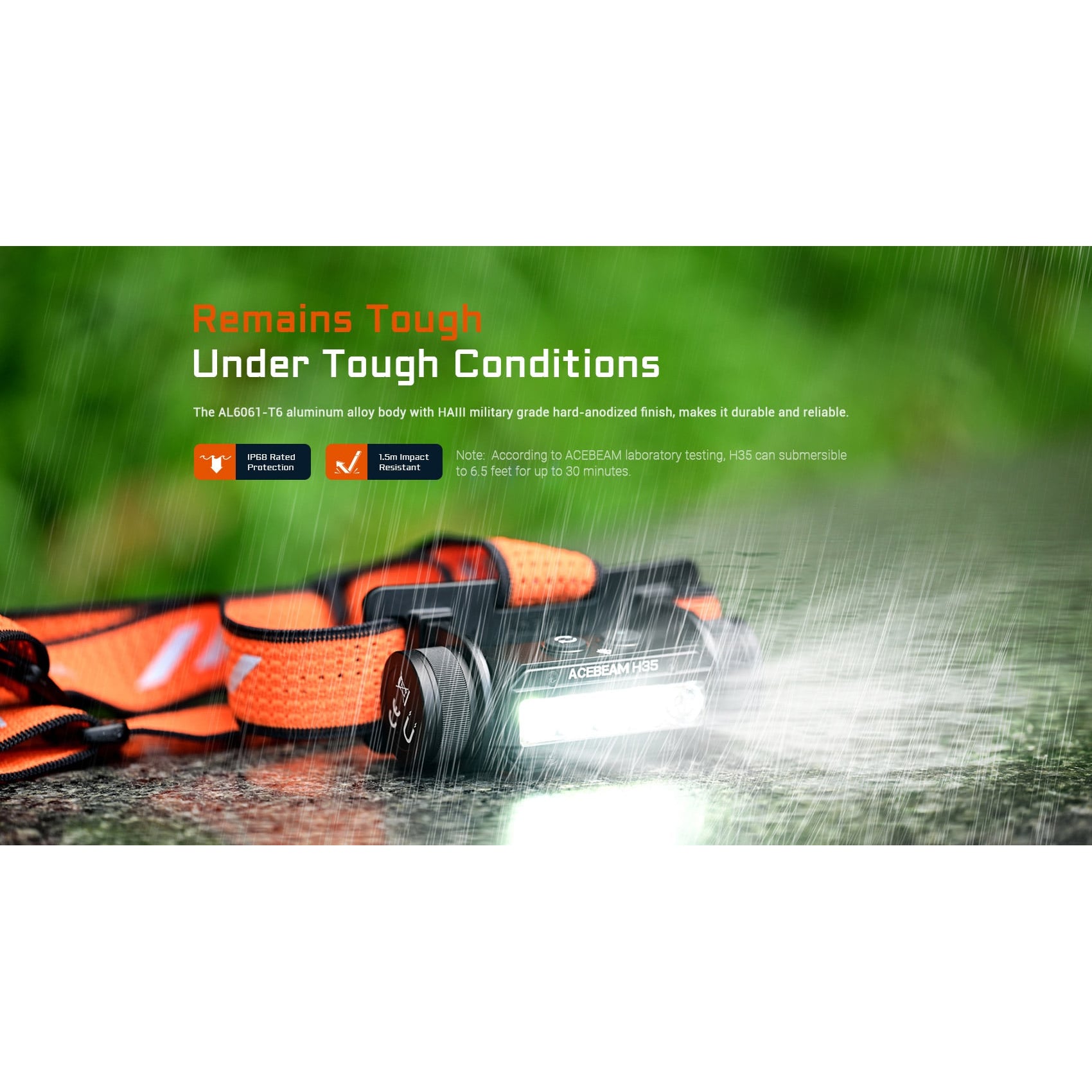 Die patentierte Halterung mit 70° stufenloser Neigungsverstellung, lange 216 h Laufzeit im Ultra-Low-Modus, USB-C Laden und IP68 machen die H35 zur zuverlässigen Lösung für harte Umgebungen.