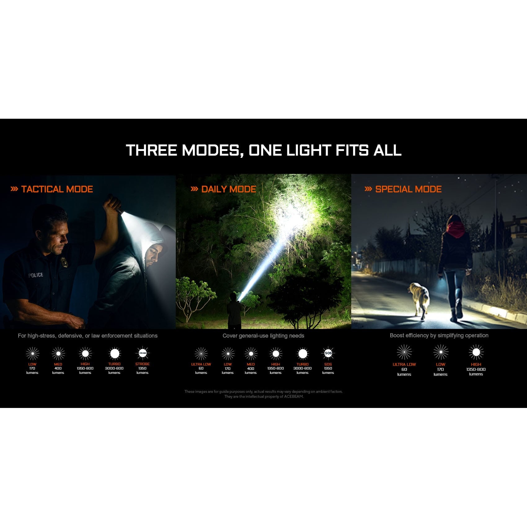 🔹 Turbo 3'000–800 lm; 73'712 cd; 543 m; 50 s + 1 h 50 min