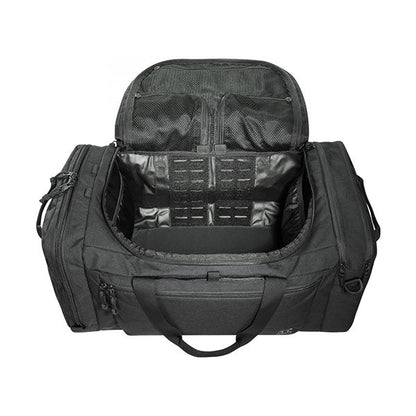 Universelle Ausrüstungstasche mit 58 Liter Volumen. Die TT Officers Bag besitzt neben dem Hauptfach an jeder Stirnseite eine Seitentasche. Eine davon ist mit einem Doppelreißverschluss versehen, um eine IFAK-Tasche für den Schnellzugriff unterzubringen, die andere ist mit MOLLE-Klett ausgestattet. Auch die Stirnseite des Hauptfachs ist mit MOLLE-Klett belegt. Das Hauptfach der Tasche besitzt abschließbare Reißverschlüsse. Die Tragegriffe lassen sich verstauen, und die Tasche kann bei Bedarf mit gepolsterten Rucksack-Schultergurten versehen werden. Diese sind im Deckel in einer Reißverschlusstasche verstaut.
