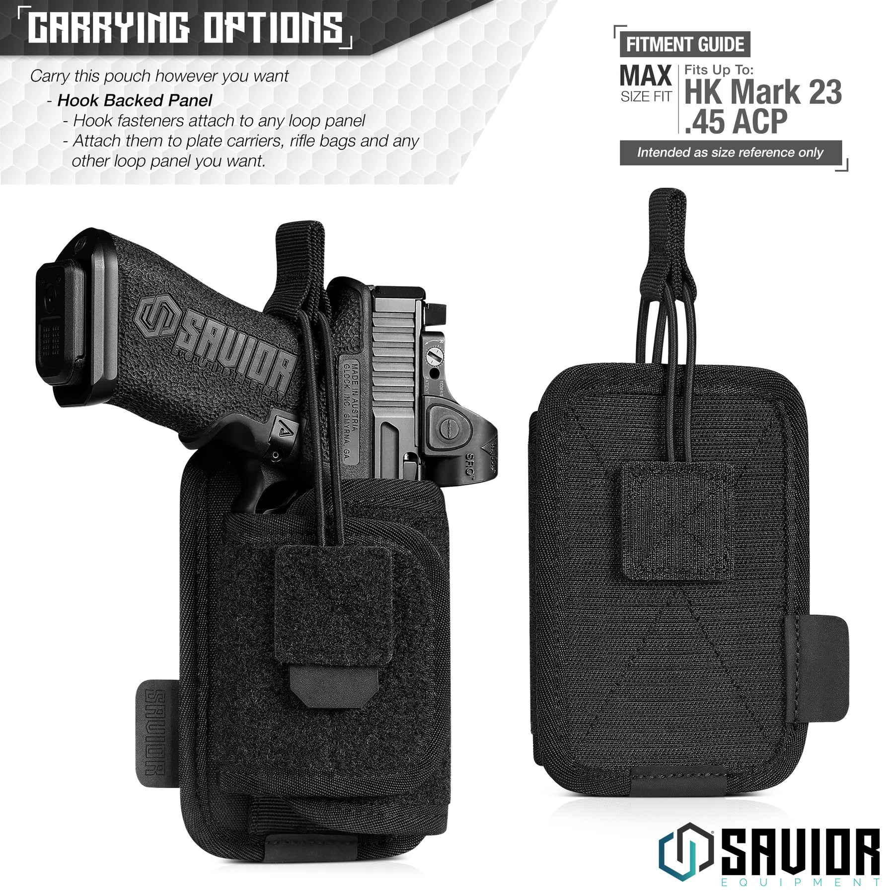 Das Universal Pistol Holster von Savior hält Pistolen von Glock 42 bis Mark 23 sicher an Ort und Stelle — mit oder ohne Waffenlicht und/oder Reflexvisier. Robust gebaut, weich ausgekleidet und einfach zu montieren auf Loop-Panels.