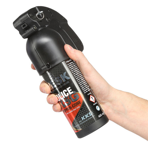 Für professionelle Abwehreinsätze im Personenschutz oder bei Polizeieinsätzen haben wir einen von uns entwickelten und patentierten Pistolengriff entwickelt dessen Spezialmechanismus den Gebrauch der Sprühdose nach gewaltsamer Entfernung aus dem Holster unterbindet.