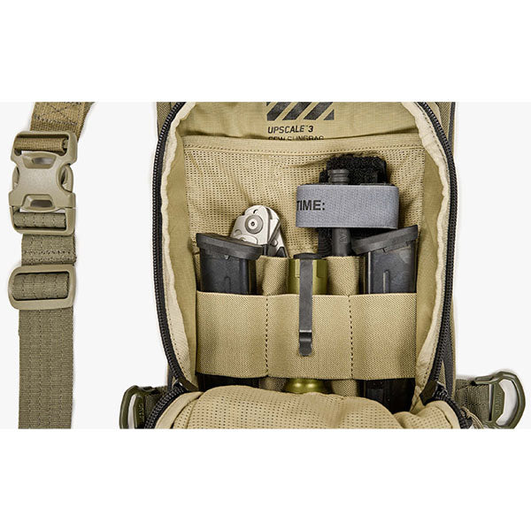 Die beidseitig verwendbare, leicht gepolsterte Schlaufe und das CCW-Fach ermöglichen einen einfachen Zugriff auf die Pistole. Das Hauptfach verfügt über ein elastisches Gurtband und eine Innentasche für zusätzliche Magazine, Tourniquets und First Aid Kits. Ein gepolstertes oberes Fach ist der perfekte Platz für Deine Sonnenbrille. Der